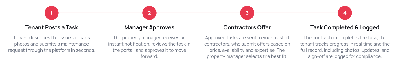 Property managers can manage tasks, review updates, and communicate with tenants and contractors at any time through the platform, no need to wait for office hours. This helps ensure critical issues are resolved without delay.